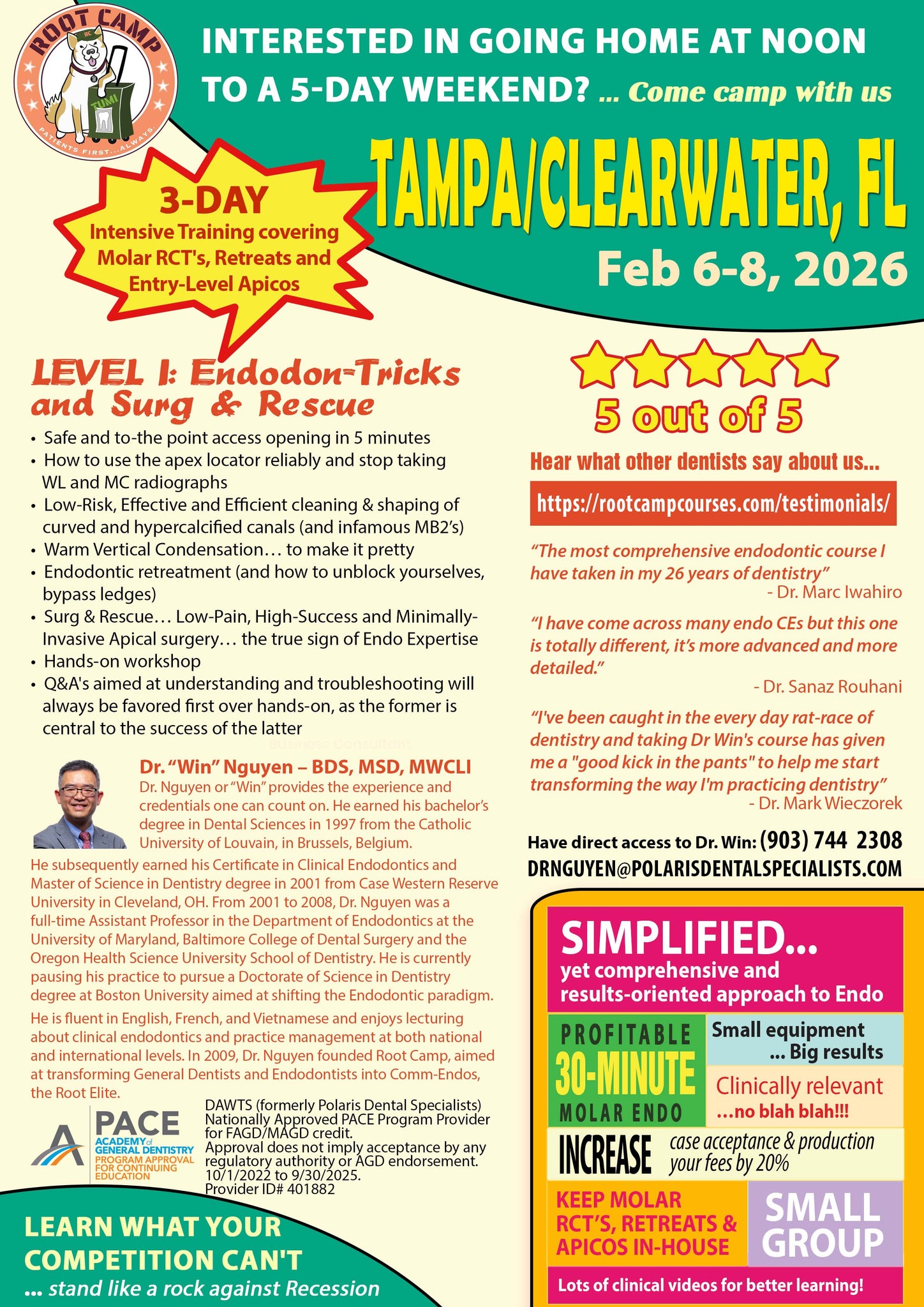 In Root Camp Level 1, learn over 3 days, the skills to tackle calcified molars, retreatment and entry-level apical surgery. Interactively presented is a tsunami of information that reiterate the core principles of clinical Endodontics, and highlight the latest and greatest innovations, from a science-supported standpoint but with a clinically-relevant and patient-centered approach. Beyond that, the course is designed to elevate general dentists to the pinnacle of their profession, fostering the "Expert Mindset" that transcends traditional clinical boundaries. Participants will not only master cutting-edge endodontic techniques but also acquire the strategic acumen to distinguish themselves in a competitive market. This will include a panoply of business and treatment planning strategies and tactics to attain the ultimate goal of "Work Less, Make More and Stress Less"