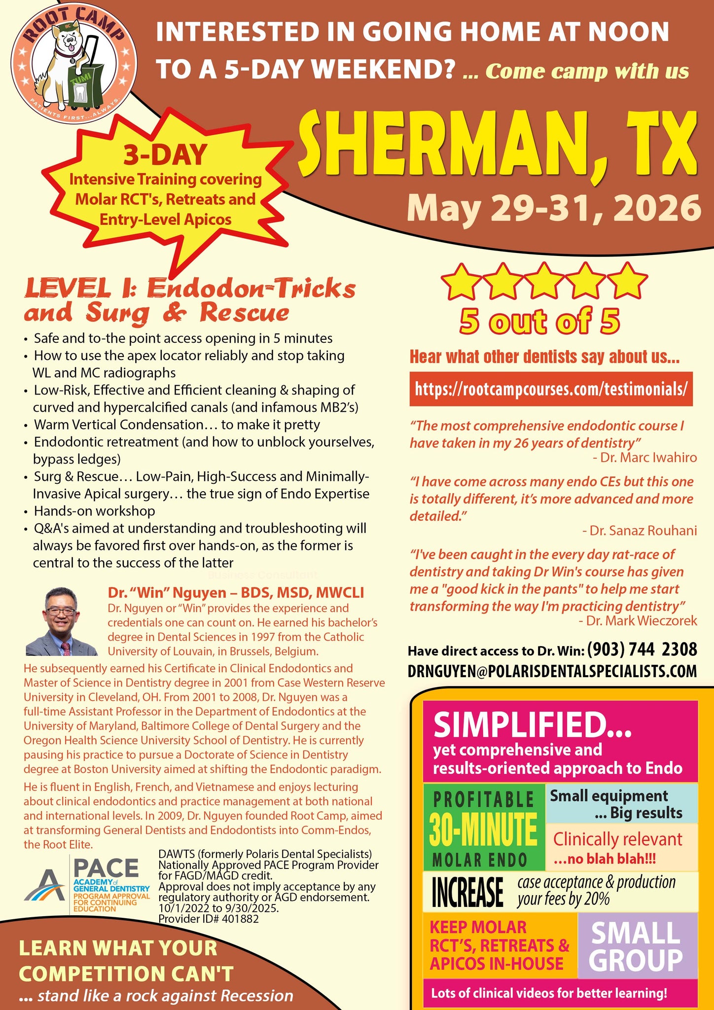 In Root Camp Level 1, learn over 3 days, the skills to tackle calcified molars, retreatment and entry-level apical surgery. Interactively presented is a tsunami of information that reiterate the core principles of clinical Endodontics, and highlight the latest and greatest innovations, from a science-supported standpoint but with a clinically-relevant and patient-centered approach. Beyond that, the course is designed to elevate general dentists to the pinnacle of their profession, fostering the "Expert Mindset" that transcends traditional clinical boundaries. Participants will not only master cutting-edge endodontic techniques but also acquire the strategic acumen to distinguish themselves in a competitive market. This will include a panoply of business and treatment planning strategies and tactics to attain the ultimate goal of "Work Less, Make More and Stress Less"