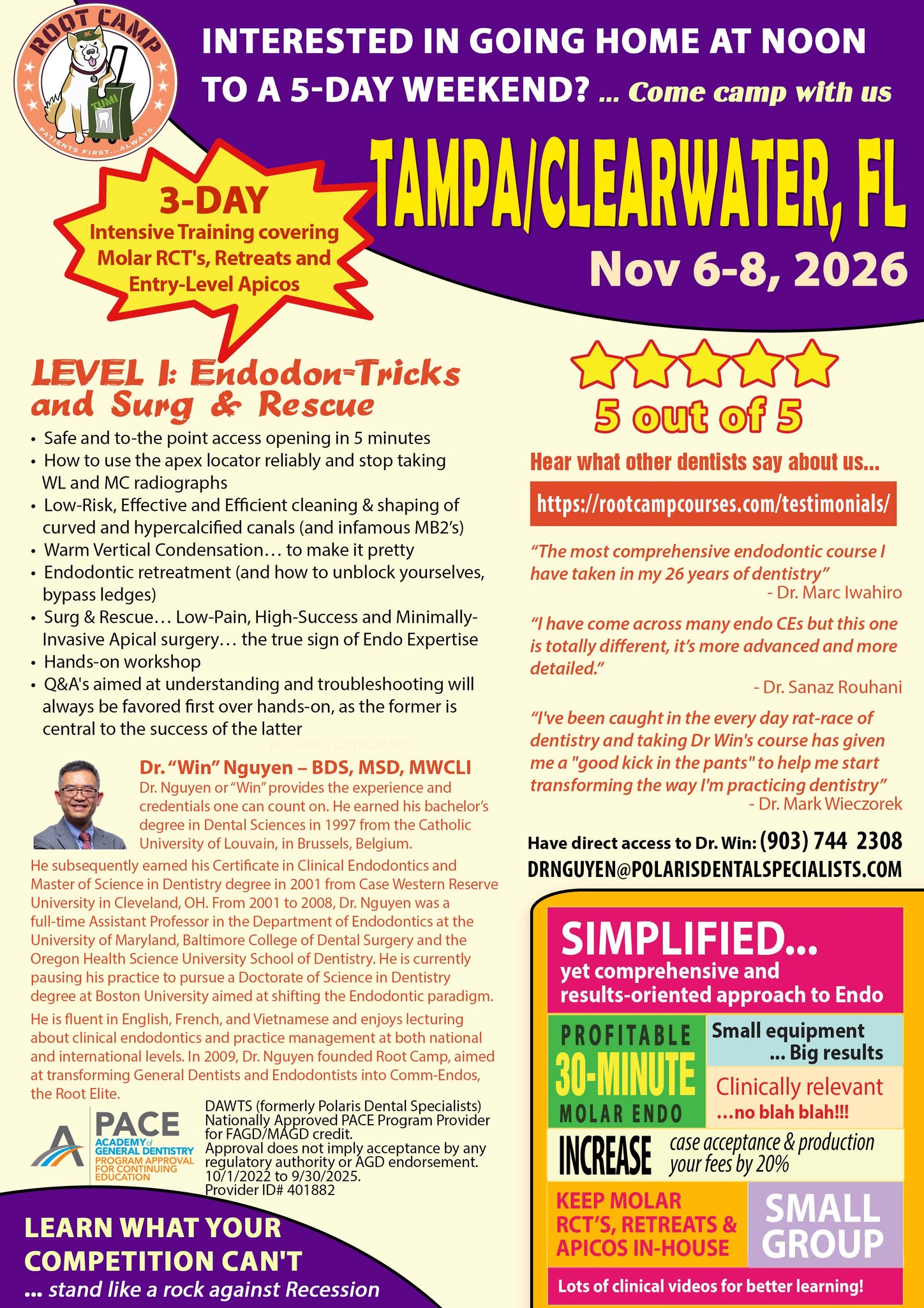 In Root Camp Level 1, learn over 3 days, the skills to tackle calcified molars, retreatment and entry-level apical surgery. Interactively presented is a tsunami of information that reiterate the core principles of clinical Endodontics, and highlight the latest and greatest innovations, from a science-supported standpoint but with a clinically-relevant and patient-centered approach. Beyond that, the course is designed to elevate general dentists to the pinnacle of their profession, fostering the "Expert Mindset" that transcends traditional clinical boundaries. Participants will not only master cutting-edge endodontic techniques but also acquire the strategic acumen to distinguish themselves in a competitive market. This will include a panoply of business and treatment planning strategies and tactics to attain the ultimate goal of "Work Less, Make More and Stress Less"