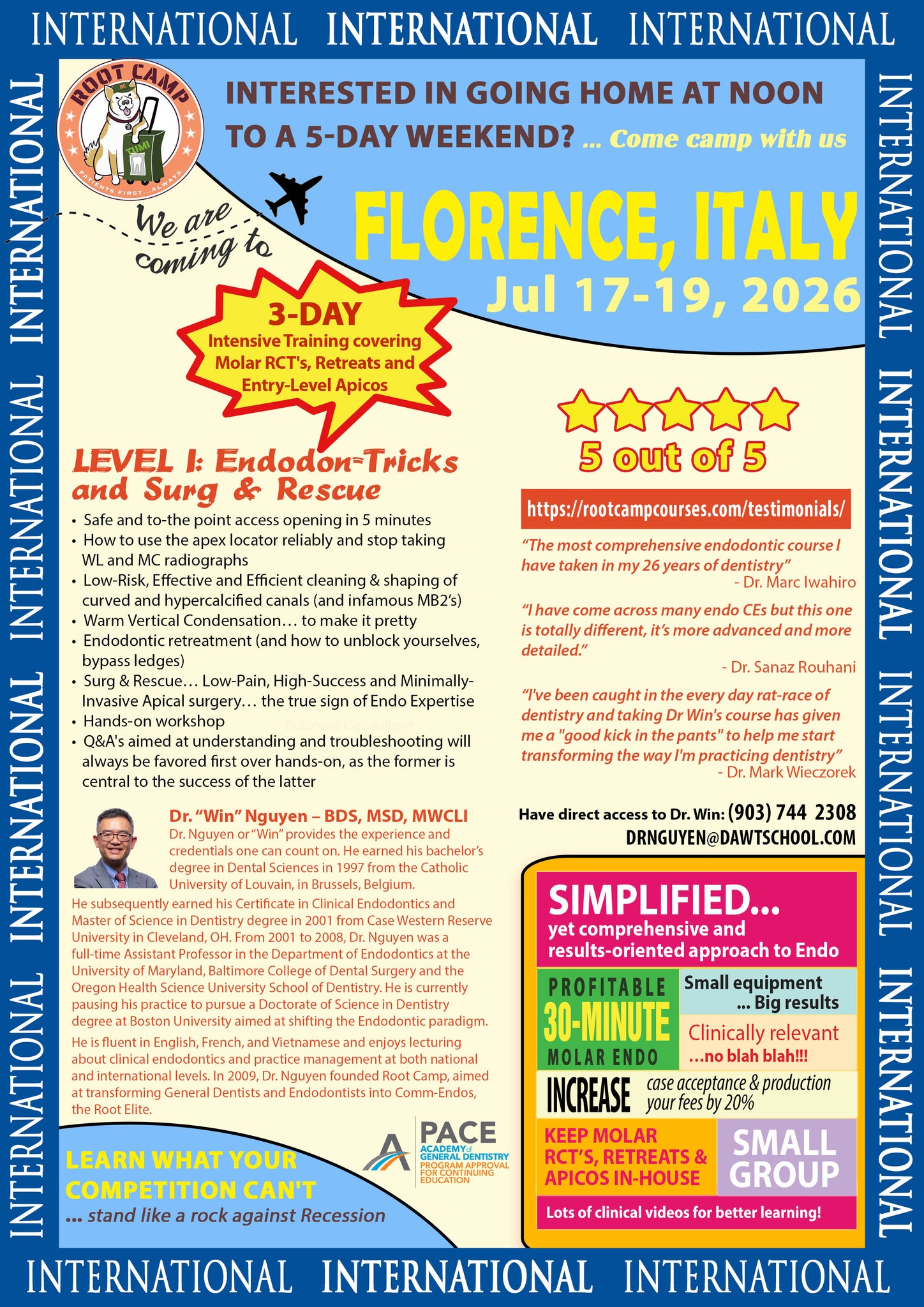 In Root Camp Level 1, learn over 3 days, the skills to tackle calcified molars, retreatment and entry-level apical surgery. Interactively presented is a tsunami of information that reiterate the core principles of clinical Endodontics, and highlight the latest and greatest innovations, from a science-supported standpoint but with a clinically-relevant and patient-centered approach. Beyond that, the course is designed to elevate general dentists to the pinnacle of their profession, fostering the "Expert Mindset" that transcends traditional clinical boundaries. Participants will not only master cutting-edge endodontic techniques but also acquire the strategic acumen to distinguish themselves in a competitive market. This will include a panoply of business and treatment planning strategies and tactics to attain the ultimate goal of "Work Less, Make More and Stress Less"